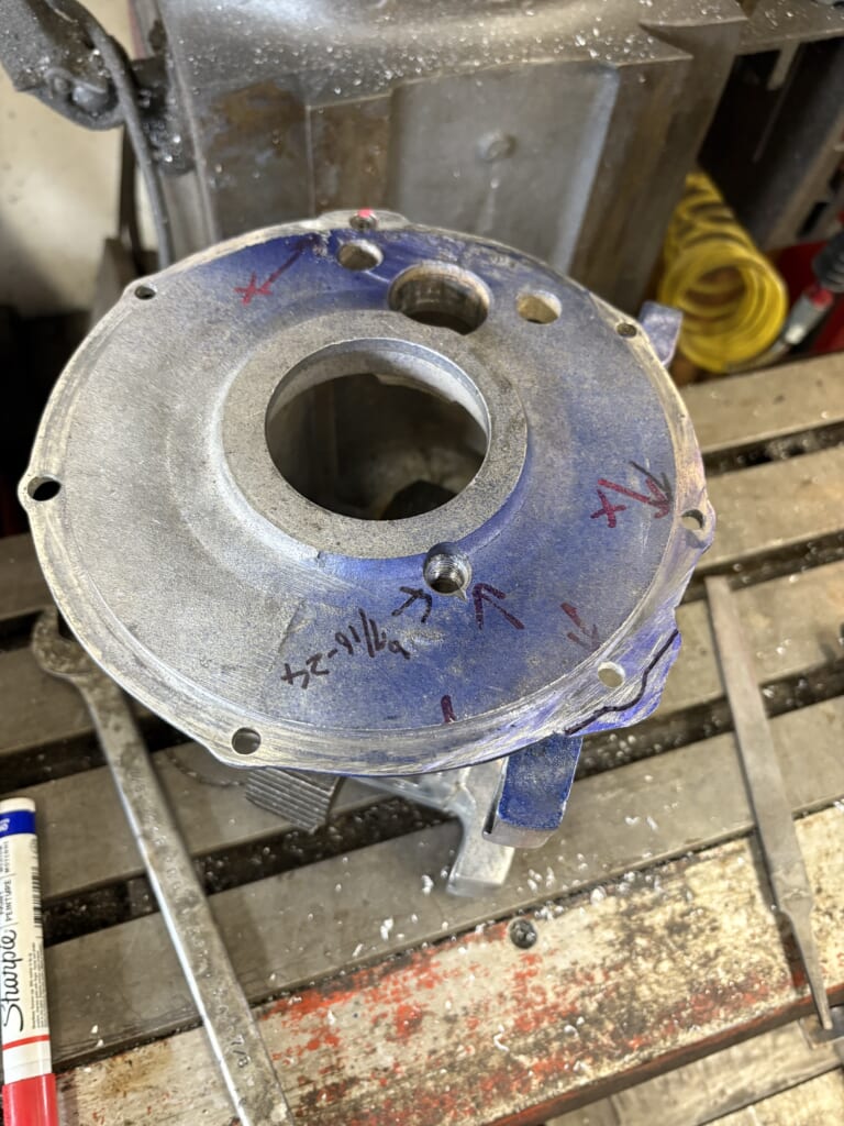 最後は右側のカウンターギアシャフトブッシングを抜く為の穴開けとメクラ加工。