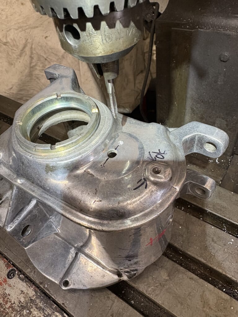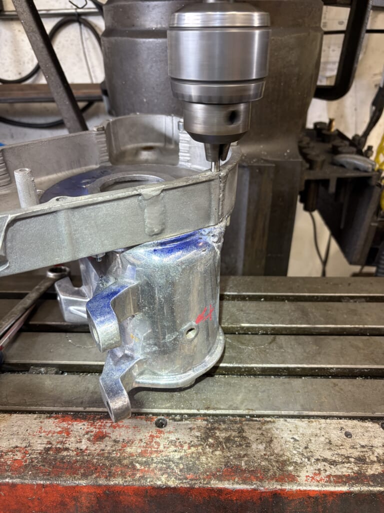 最後は右側のカウンターギアシャフトブッシングを抜く為の穴開けとメクラ加工。