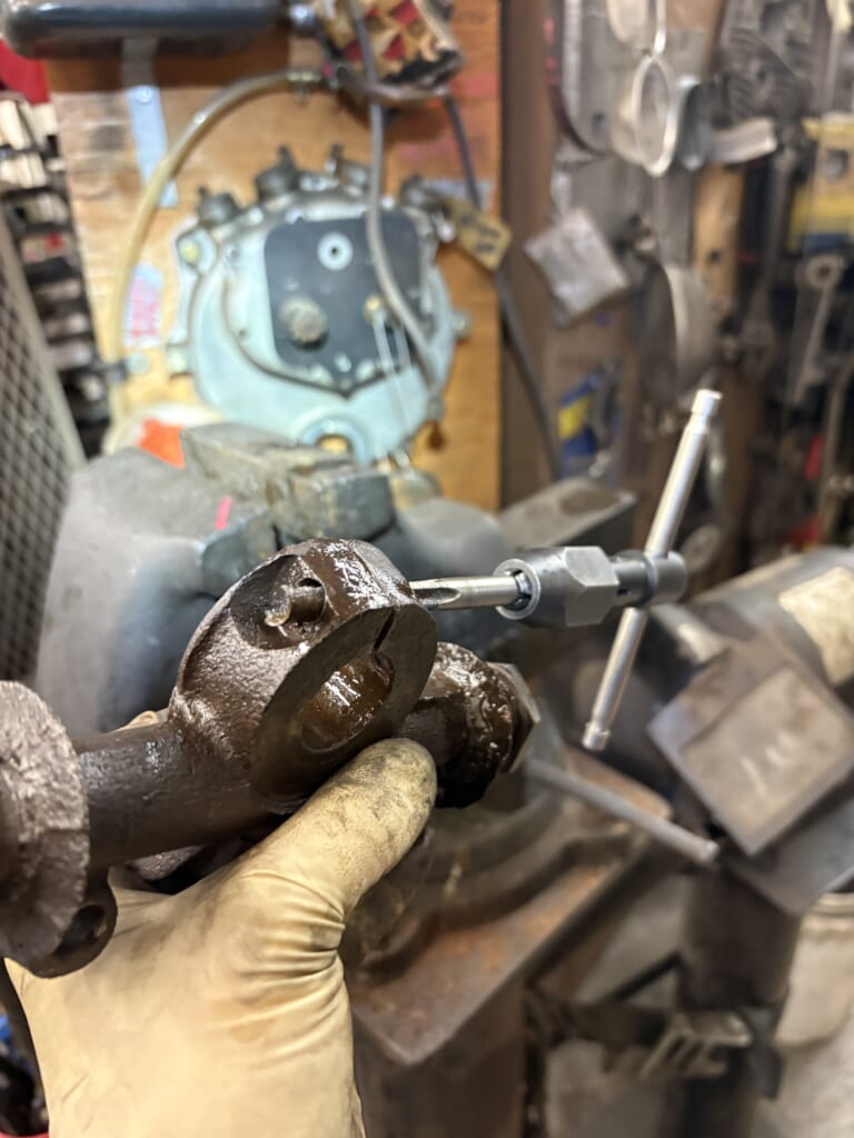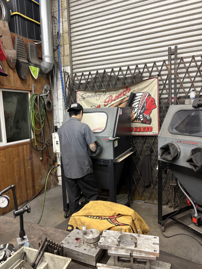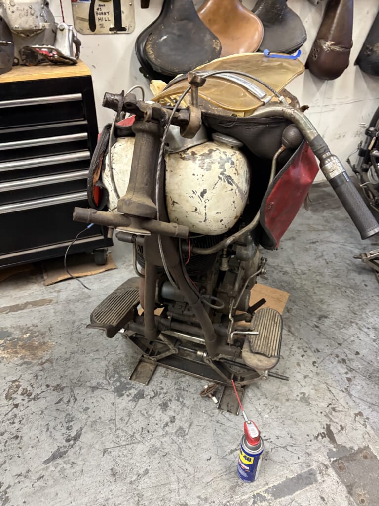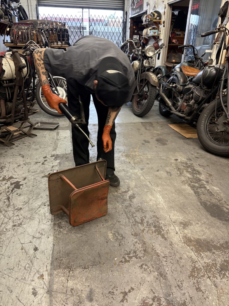HOME > Indian Chief > Jason’s Bonneville Chief 3 2026/02/10 2026/02/12 フロント周り。動きが悪いので点検。 分解 トップブラケットのネジが折れています… 慎重に穴を開けて どうにか古いボルト摘出 無事にトルクかかるようになりました。 村松君にフロントエンドの組み方やバイパーホーニングも教えたり 作業椅子のメンテもお願いしました。 スモーキーから引き継いだ椅子。まだまだ使えそうですね。 GT B! LINEへ送る - Indian Chief, USA