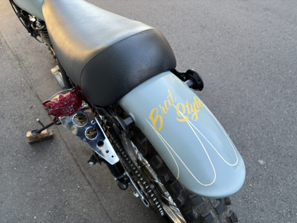 前回VMXでも紹介したものですが、その名の通り、細くて小さいタンクは跨ったときに圧迫感がないです。そしてFRP製なのでとにかく軽い! バイクが軽くなると、それだけで気軽に乗れる気がしませんか?原チャリがスイスイ走れるのも納得。 そして、タンク下のラインがシート下のラインに向かって真っすぐ伸びていて、地面と綺麗に水平を出しているんです。これこそがBRATのバイクはバランスが良い、ラインがキレイといわれる所以でしょう。