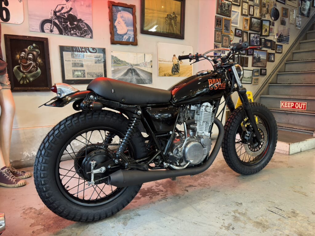 ブラック基調で統一したBRAT Originalスクランブラースタイル。ブロックタイヤを装着し、街乗りはもちろんツーリングや林道まで幅広く楽しめる仕様になっています。