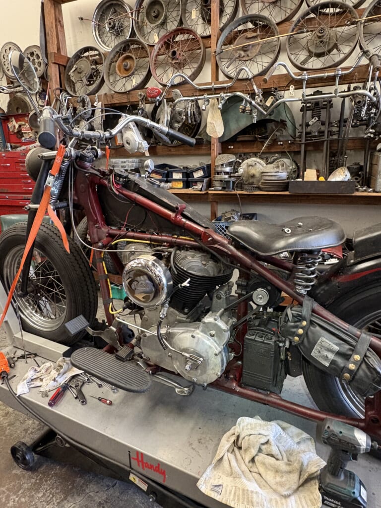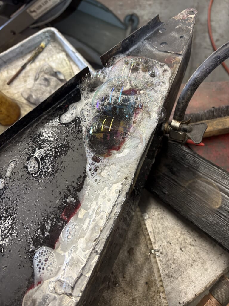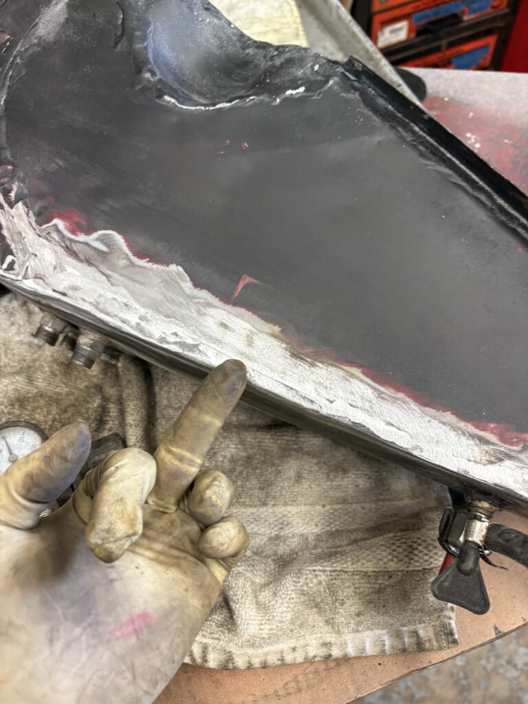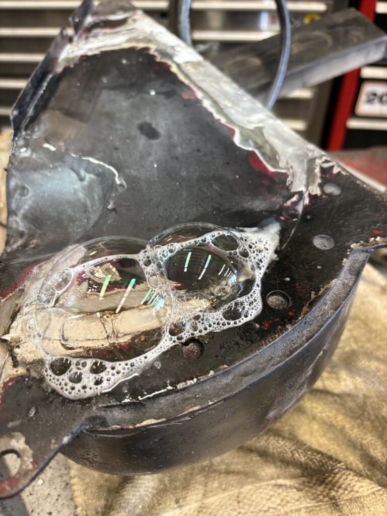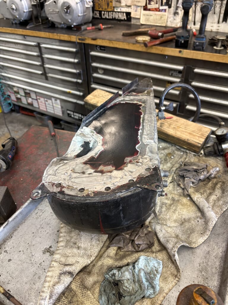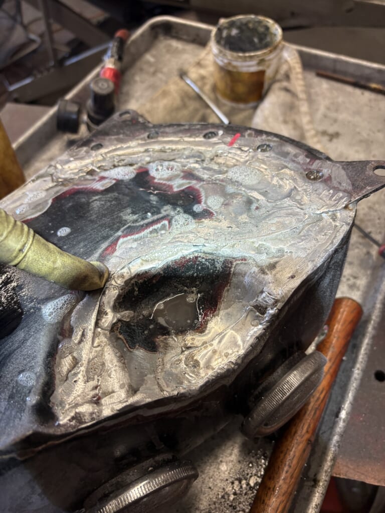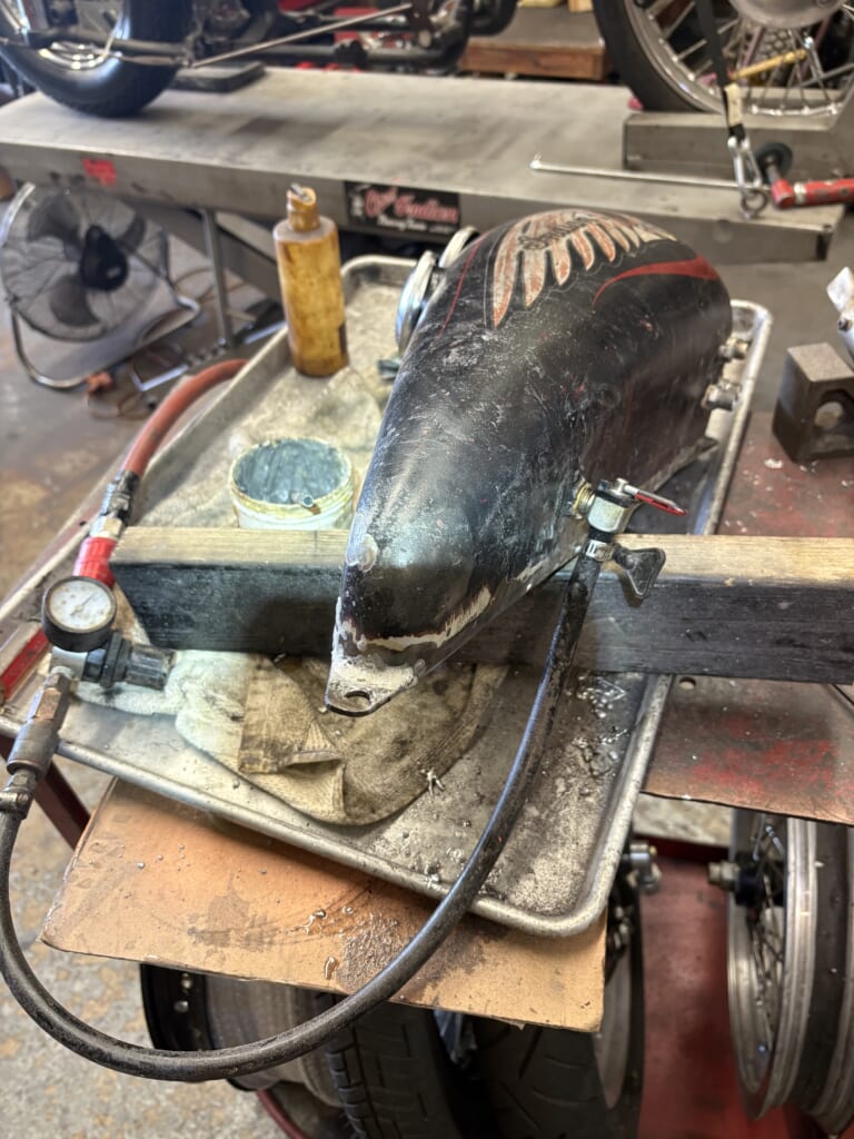 HOME > Indian Chief > 1947 Indian Chief/Gas Tank 2026/04/03 トランスミッション組込完了。次はタンク。前回最後に走った高速テスト中にガスが漏れてきました。 リークの場所を皮むき。かなり割れています。 修正してテストすると次々と新しい箇所からリークしてきました…今まで漏れていなかったか不思議です。 ここも… 既にに板が貼られていてその周りがダメでした。 リークテストして右タンク完了。 ほぼ一周しました… 念の為、左のタンクもテストすると少し漏れがあったので修正。 1日かかりましたが無事に修正完了! GT B! LINEへ送る - Indian Chief, USA