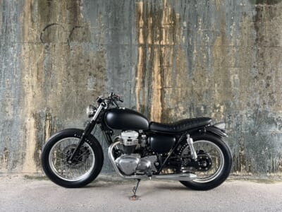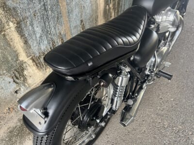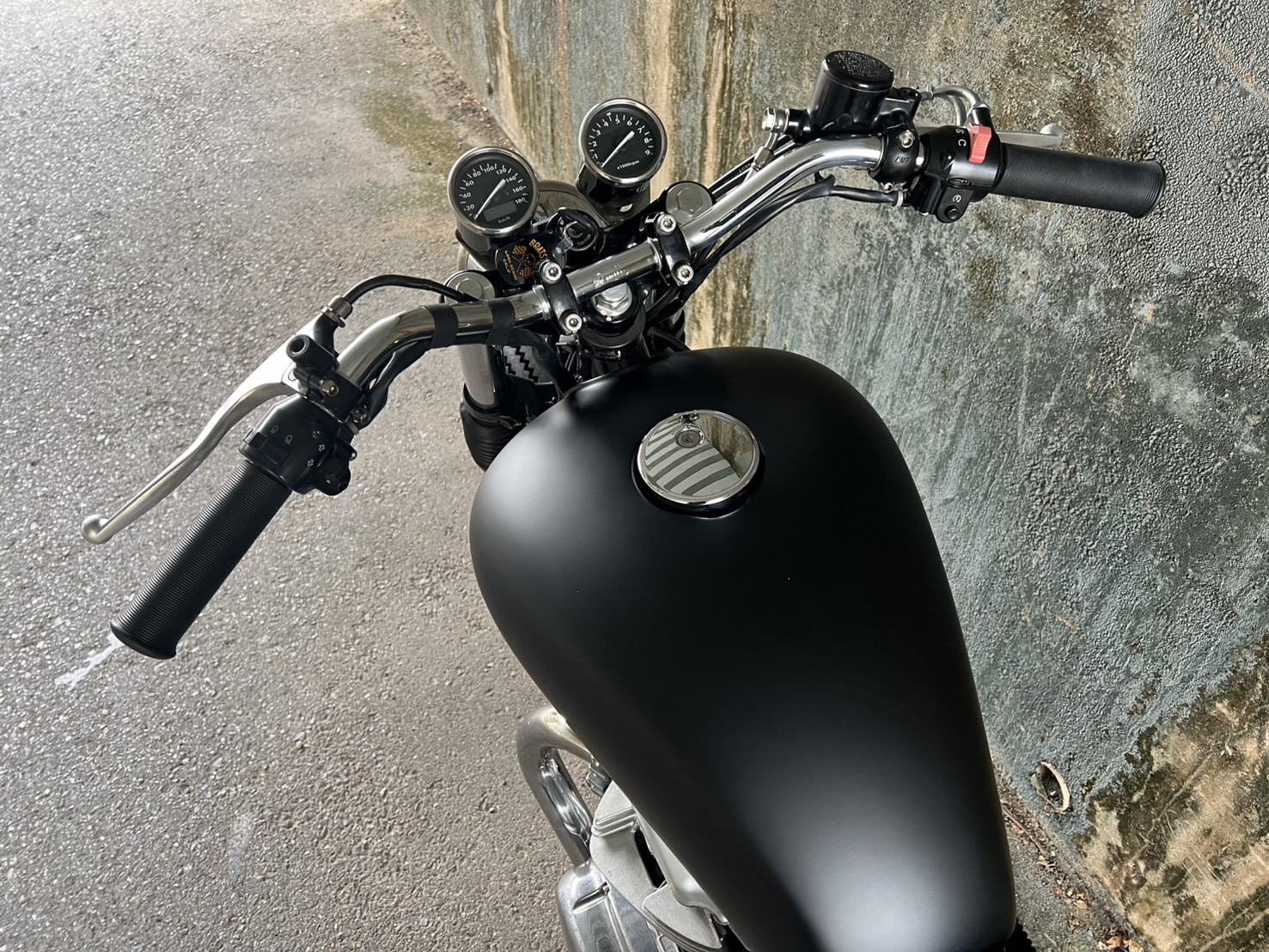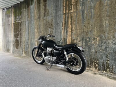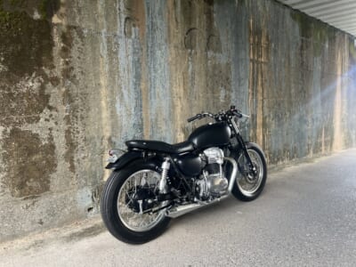 今回は一見ワイルドな印象のマットブラックの外装をまとったBobberスタイルのダブロクで、そのワイルドさと相反してポリッシュされたエンジンケース、クロームメッキマフラー、各所メッキパーツとのコントラストが非常に品のある一台。