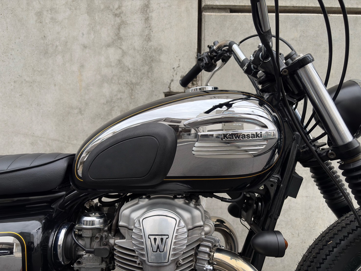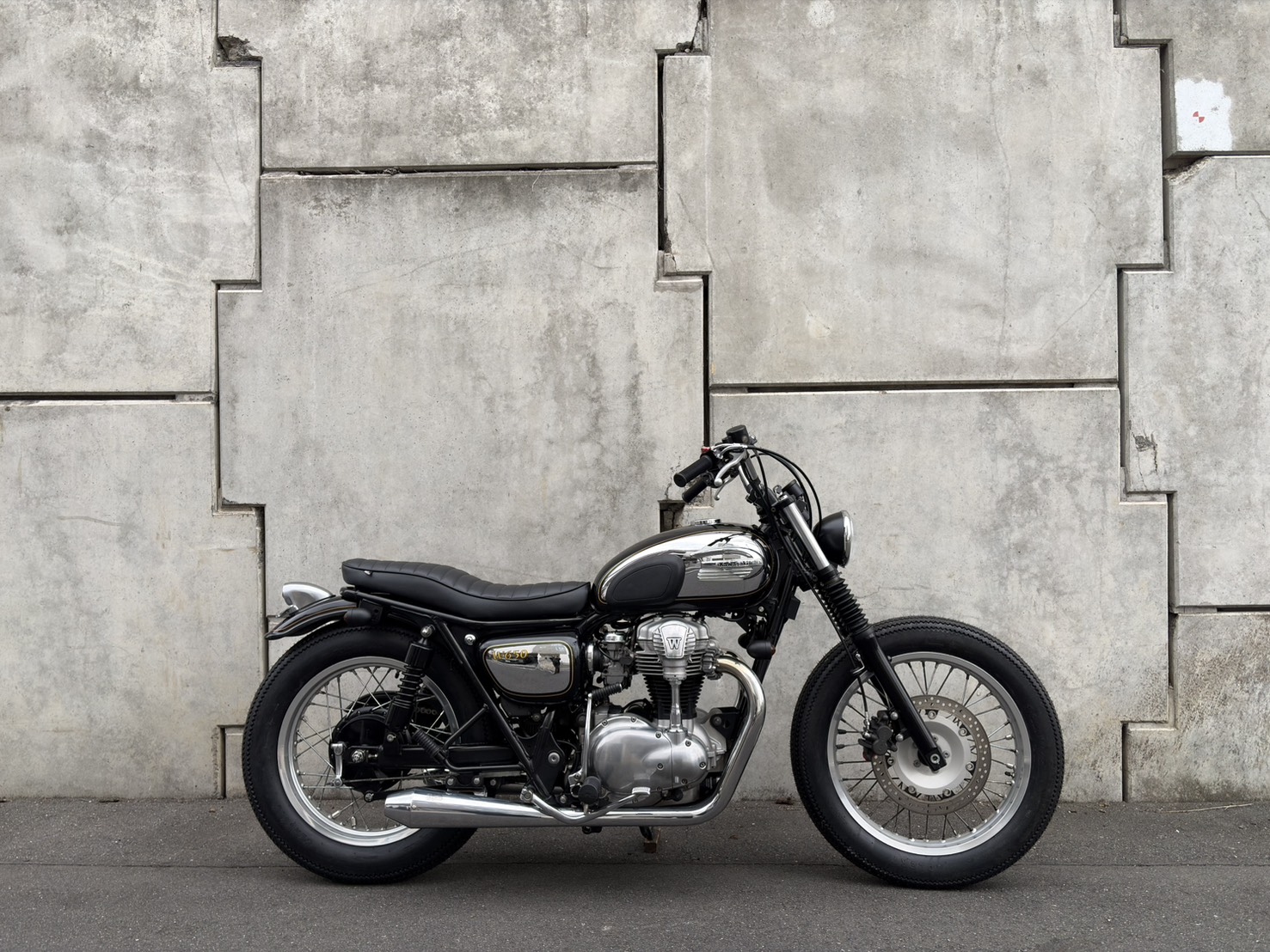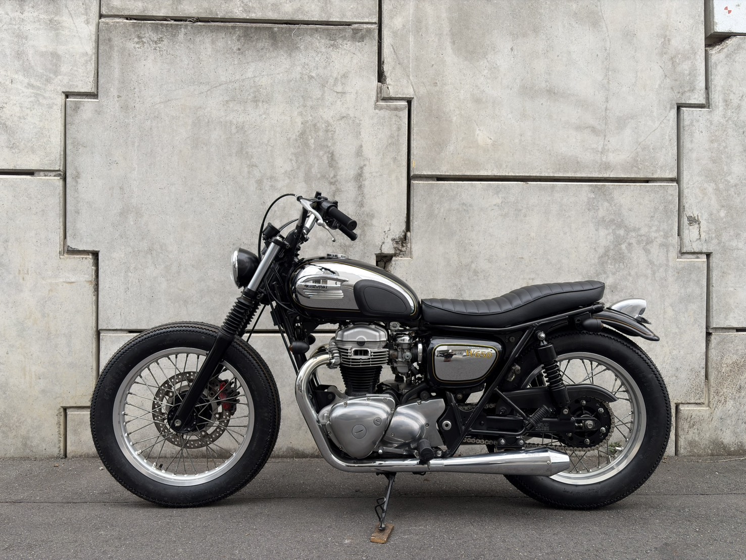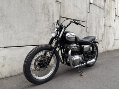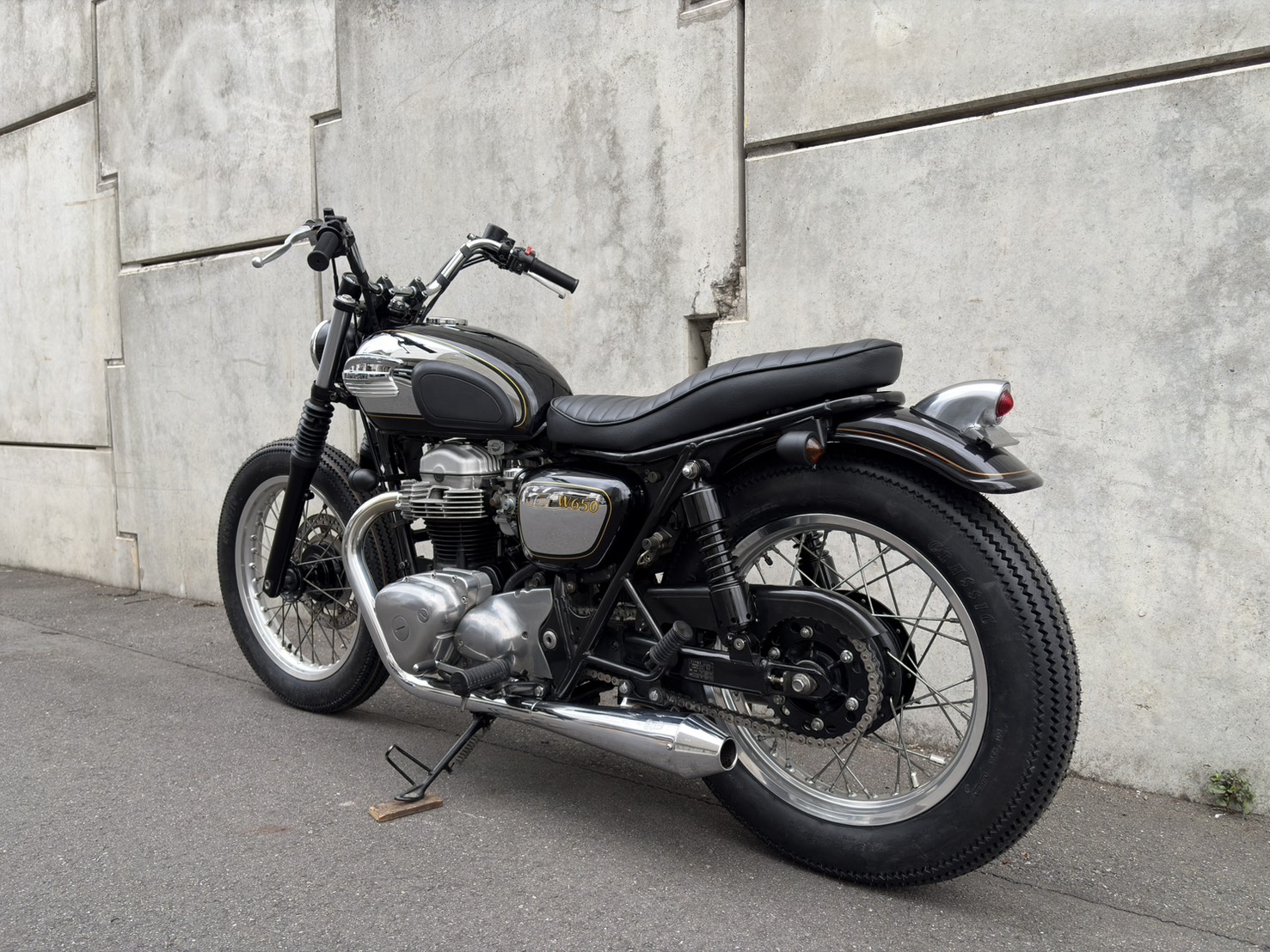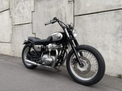 99年のW650をベースに限定Chrome Editionの外装を使い、ブラットスタイルのオリジナルパーツで丁寧に仕上げた一台。